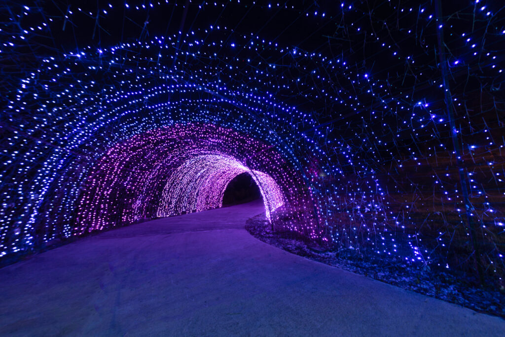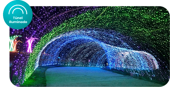 Atravesse um túnel com 60 metros de extensão envolvido por luz, criando um percurso onde cada passo revela novas cores e perspectivas.
