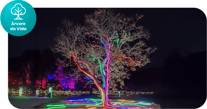 Uma árvore encantada envolvida por luzes que percorrem sua estrutura e transformam sua presença em um dos cenários mais marcantes da noite.