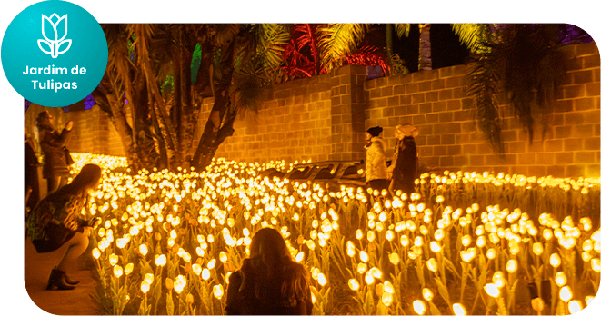 Caminhe entre tulipas iluminadas em amarelo intenso, que se destacam na noite e criam o cenário perfeito para fotos, encontros e momentos especiais.