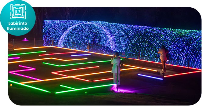 Percorra um labirinto cercado por luzes, onde crianças e adultos exploram caminhos de forma leve e divertida.